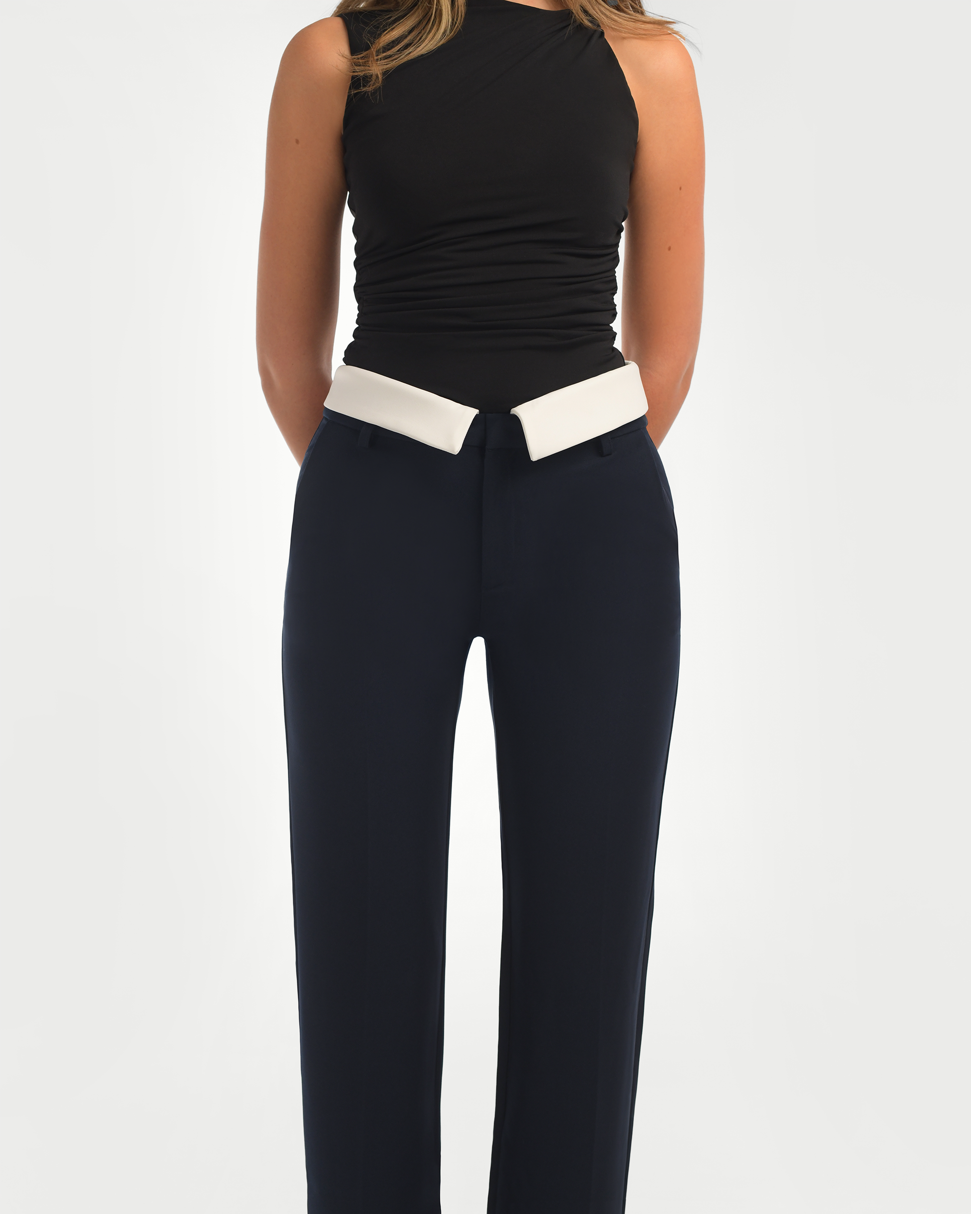 Elevate your wardrobe with our Versatile Tailored Navy Trousers, a modern take on classic tailoring. These pants feature a unique white removable detail that allows you to customize your look, making them perfect for multiple styling options. Designed with a sleek, tailored fit, they offer a polished silhouette that flatters every figure. The fabric ensures comfort and durability, while the innovative detachable element adds a touch of creativity and versatility to your outfit.