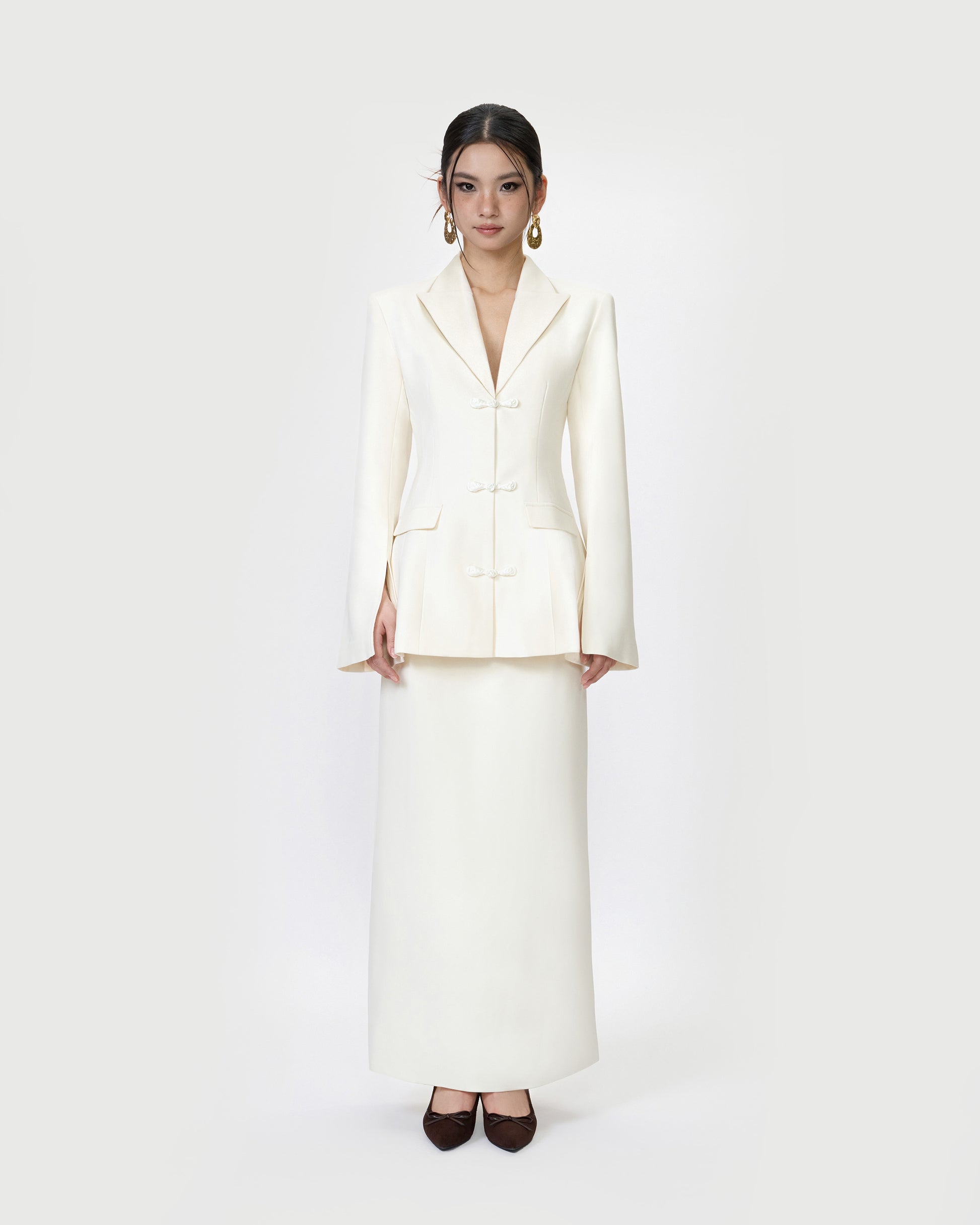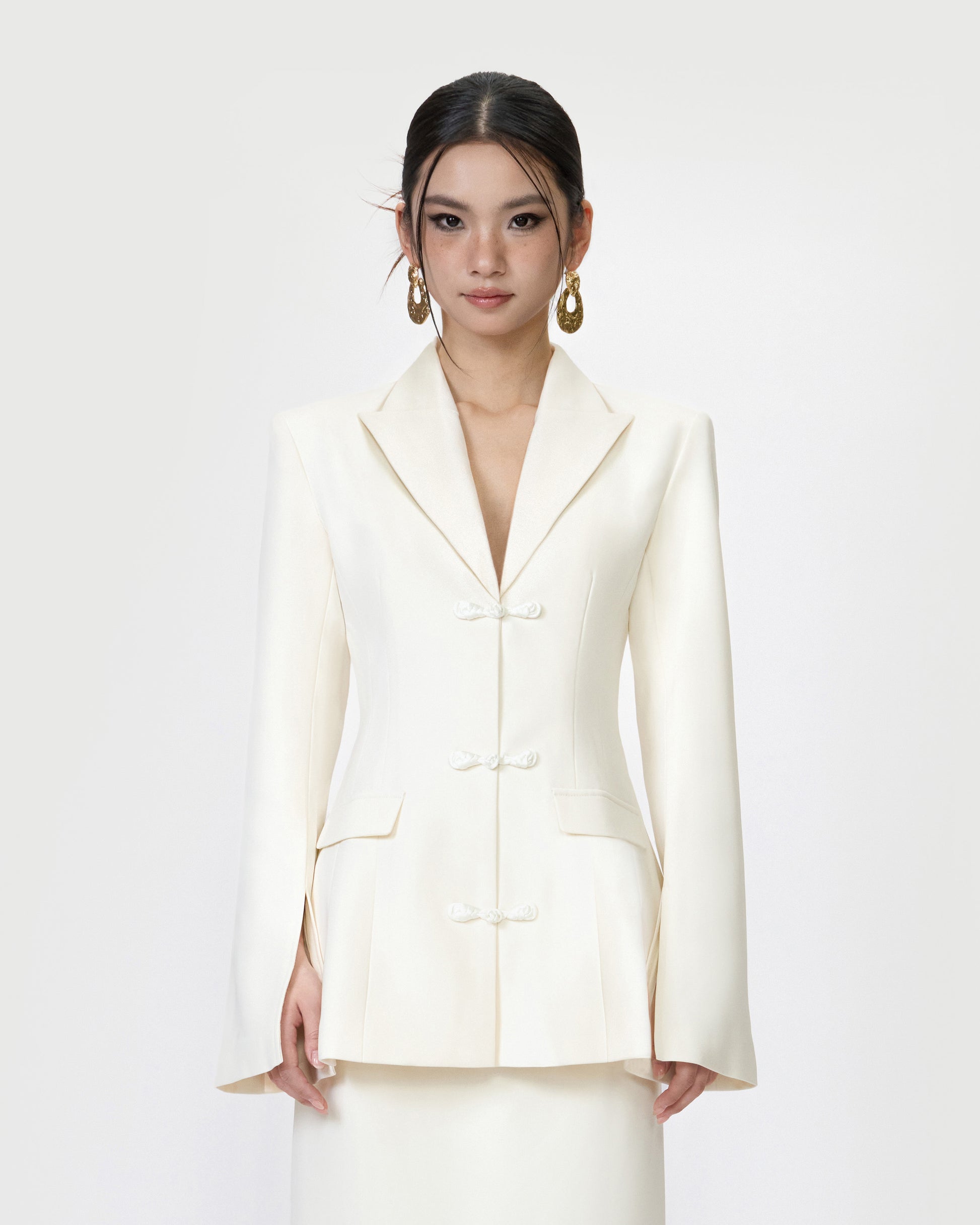 Finished with traditional Pankou (盘扣) buttons, the design references classic Chinese closures while maintaining a refined, minimal aesthetic. The result is a statement blazer that feels architectural, considered, and timeless.