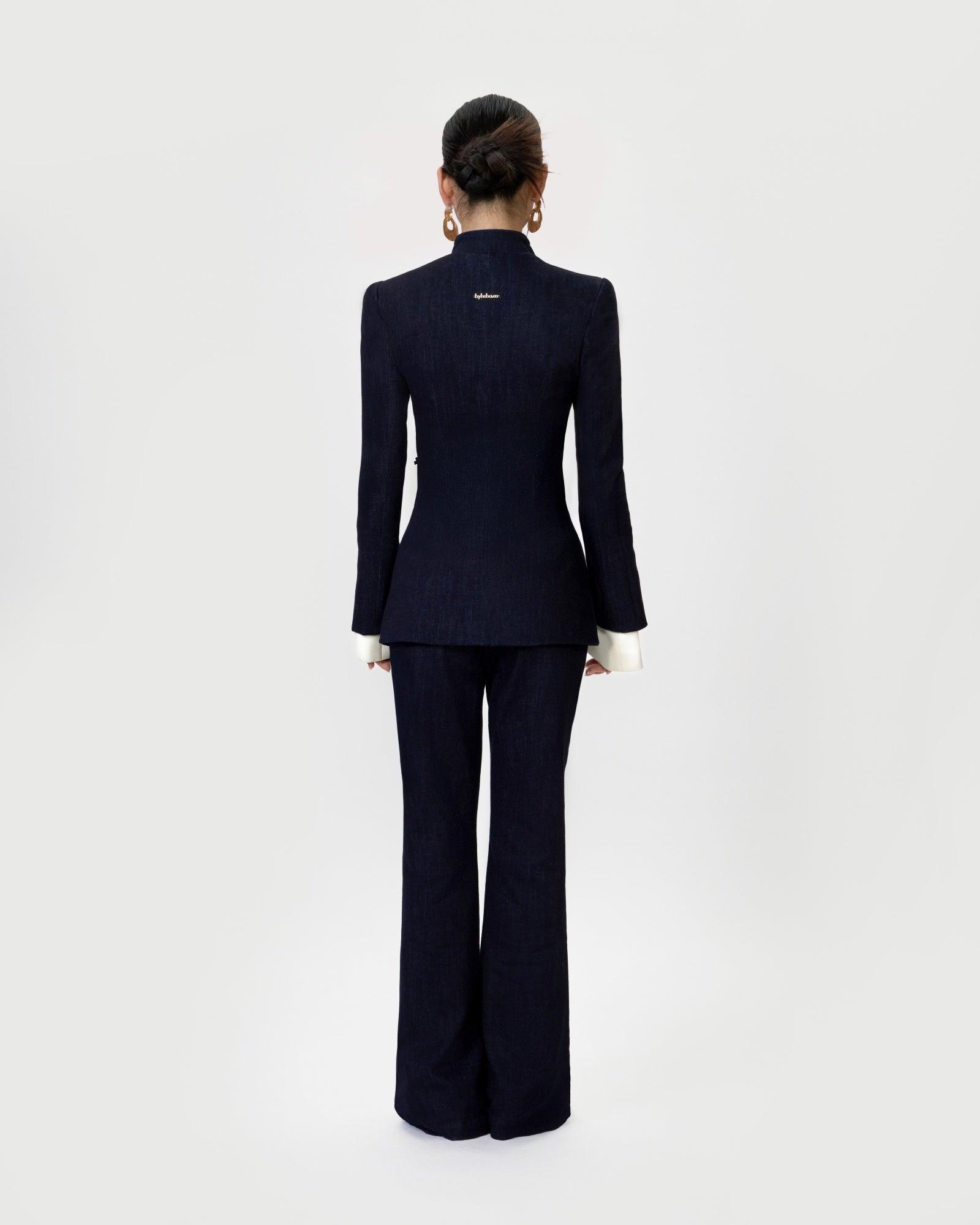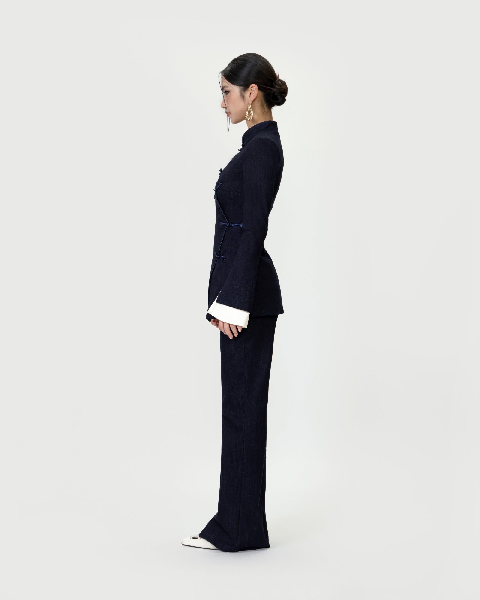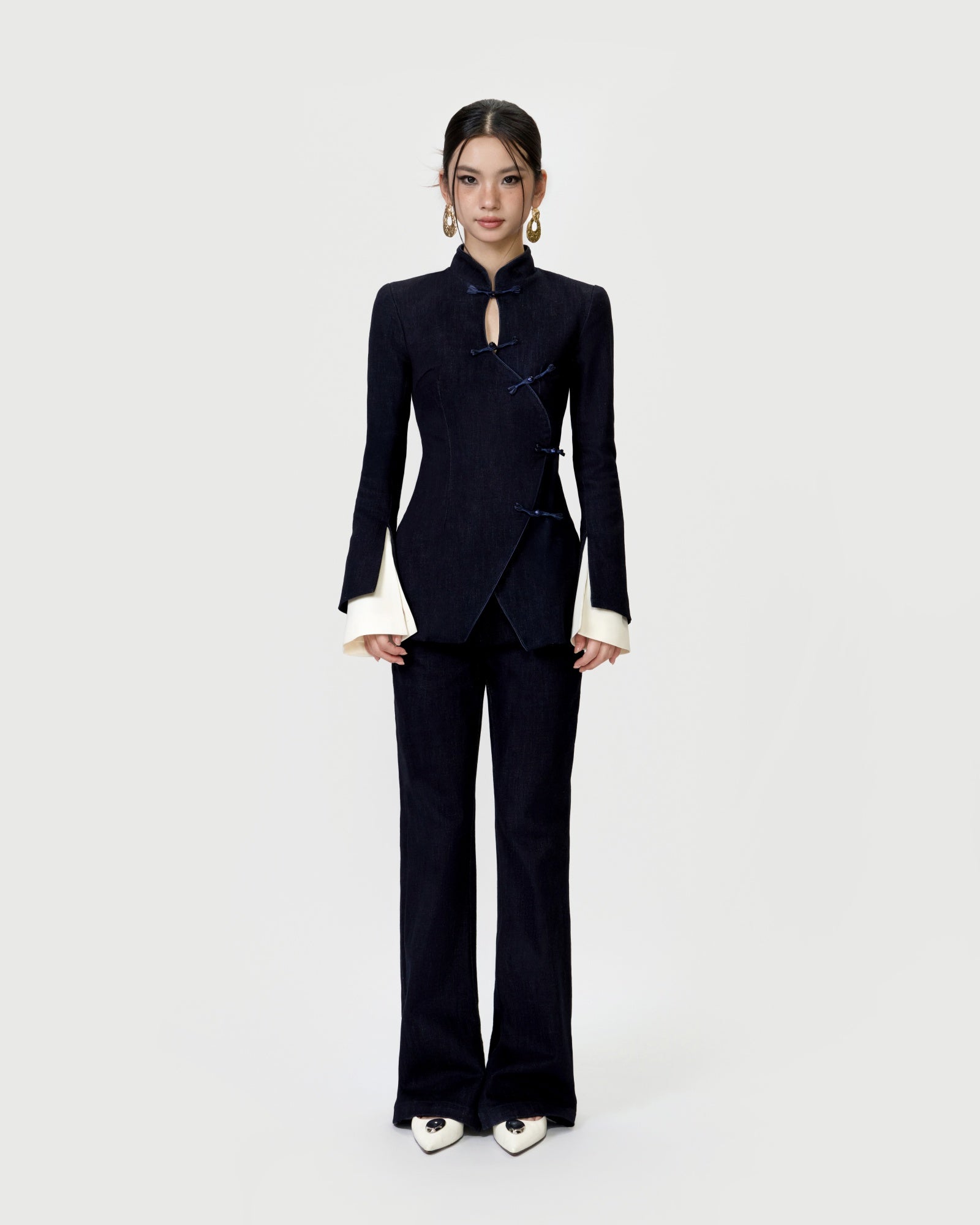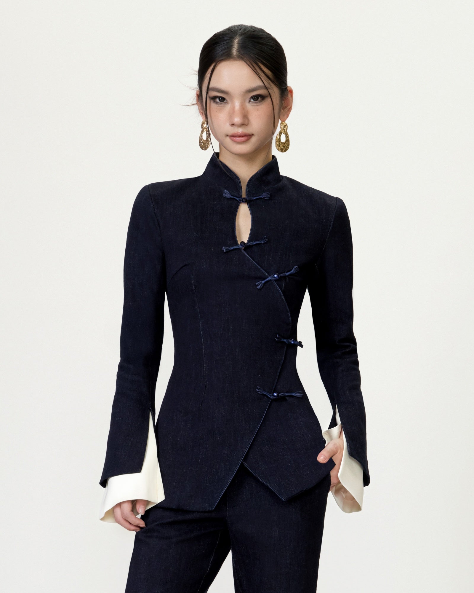 An elegant fusion of heritage and modern craftsmanship, our Qipao Inspired Denim Top reimagines a timeless silhouette through a contemporary lens. Crafted from premium Japanese selvedge denim, this sculpted set draws inspiration from the traditional Chines qipao, blending cultural elegance with sharp, modern tailoring.